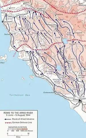 IV-й корпус поступово з боями також просувався крізь оборонні перепони німців і 1 липня зміг форсувати річку Чечина та прорватися до Ліворно. Французькі ж війська надовго зав'язли у боях на річці Орча на захід від озера Тразімено й билися тут до того часу, доки німецькі парашутисти не відступили 3 липня до Сієни.