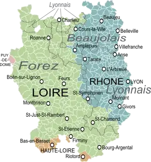 Межі Ліонського генералітету в XVIII столітті з провінціями Ліонне, Божоле та Форез, накладені на сучасну карту