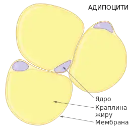 У людей найбільша кількість жирової тканини розташована під шкірою (так звана підшкірна клітковина), особливо в районі живота та молочних залоз. Особі з легким ожирінням (15—20 кг тригліцеридів) таких запасів може вистачити для забезпечення енергією впродовж місяця, в той час як всього запасного глікогену вистачить менше ніж на добу[2].