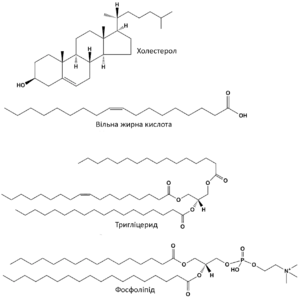Ліпі́ди — це група органічних речовин, що входять до складу живих організмів і характеризуються нерозчинністю у воді та розчинністю в неполярних розчинниках, як-от діетилетер, хлороформ та бензен[1]. Це визначення об'єднує велику кількість сполук різних за хімічною природою, зокрема таких, як жирні кислоти, воски, фосфоліпіди, стероїди та багато інших. Також різноманітними є і функції ліпідів у живих організмах: жири є формою запасання енергії, фосфоліпіди та стероїди входять до складу біологічних мембран, інші ліпіди, що містяться в клітинах в менших кількостях можуть бути коферментами, світлопоглинаючими пігментами, переносниками електронів, гормонами, вторинними посередниками під час внутрішньоклітинної передачі сигналу, гідрофобними «якорями», що утримують білки біля мембран, шаперонами, що сприяють фолдингу білків, емульгаторами у шлунково-кишковому тракті[2].
