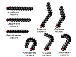 Жирні кислоти — це карбонові кислоти, молекули яких містять від чотирьох до тридцяти шести атомів карбону. У складі живих організмів було виявлено більше двохсот сполук цього класу, проте значного поширення набули близько двадцяти. Молекули всіх природних жирних кислот містять парну кількість атомів карбону (це пов'язано із особливостями біосинтезу, який відбувається шляхом додавання двокарбонових одиниць), переважно від 12 до 24. Їх вуглеводневі ланцюжки зазвичай нерозгалужені, зрідка вони можуть містити трикарбонові цикли, гідроксильні групи або відгалуження[1][2].