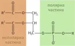 Залишки жирних кислот неполярні, тому вони утворюють гідрофобну частину молекули гліцерофосфоліпідів, так звані гідрофобні хвостики. Фосфатна група у нейтральному середовищі несе негативний заряд, в той час, як азотвмісна сполука — позитивний (деякі фосфогліцериди можуть містити також і негативно заряджений або нейтральний радикал), отже ця частина молекули полярна, вона утворює гідрофільну голову. У водному розчині фосфогліцериди утворюють міцели, в яких голови повернуті назовні (до водної фази), а гірофобні хвостики — всередину.[1]