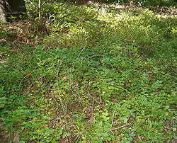- Трав'яний ярус включає однорічні й багаторічні трави, а також чагарники. У листопадних лісах трав'яна рослинність найкраще розвивається навесні. Пізніше, коли листя разом і гілля вищих ярусів утворять щільний намет, розвиток цього ярусу затримується. В лісах зі сталим листяним покривом трав'яний ярус менше змінюється протягом річних циклів і залежить головним чином від вертикальної структури намету (одно-, дво- чи триярусного)[10]. Трав'янисті рослини лісу набули ряд особливостей, котрі дозволили їм пристосуватися до умов, які складаються в ярусі. Так, вони, як правило, тіньовитривалі, багато з них не витримують впливу прямих сонячних променів і не здатні існувати на відкритому просторі. Часто вони мають широкі листові пластинки, що дозволяють їм накопичувати органічні речовини при слабкому освітленні. У темних лісах трав'янисті рослини мають квіти білого кольору, щоб вони були здалеку видні комахам-запилювачам. Однак квітки трав лісу часто не запилюються та не утворюють насіння, тому розмноження багатьох трав'янистих рослин здійснюється поділом кореневищ, через що ці трави часто ростуть у лісі групами[11].