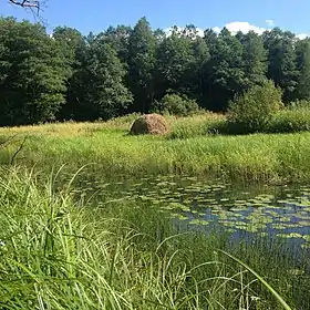 В низинній місцевості, по якій протікає річка, утворені заплави, покриті очеретом та осокою.