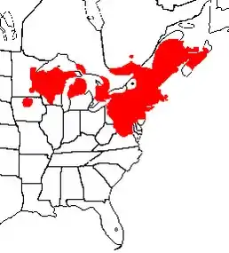 Мешкає у Канаді: Новій Шотландії, Нью-Брансвікі, Квебеці, Онтаріо, США: Мен, Нью-Гемпшир, Массачусетс, Коннектикут, Нью-Йорк, Пенсільванія, Нью-Джерсі, Делавер, Меріленд, Вірджинія, Західна Вірджинія, Огайо, Мічиган, Вісконсин, Міннесота, Айова.