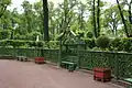 - Регулярне, геометричне розпланування саду в 2012 році підсилюють дерев'яні наскрізні паркани, пофарбовані в зелений колір. Вони — своєрідний кордон, до якого можуть рости кущі. Саме за лініями цього кордону кущі будуть вистригати. Адже сад бароко дозволяє досить активне втручання садівників у зростання рослин, у формування крон. Коли кущі підростуть і зміцніють, їх вистрижуть, а дерев'яні паркани приберуть (за планом — роки через три).