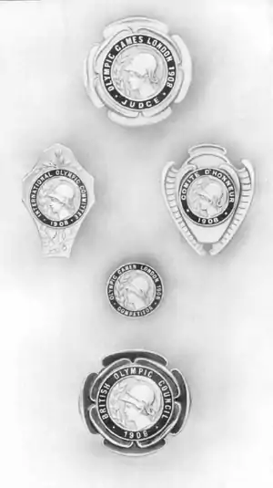 Значки | Для ідентифікації учасників, суддів, членів Британської олімпійської ради, членів МОКу, членів Comité d’Honneur були розроблені спеціальні нагрудні значки, на яких була зображена голова в шоломі, та був наявний підпис, наприклад Competitor, International Olympic Comittee та інші.[62] |