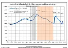 Динаміка населення з 1875 року в сучасних кордонах (Синя лінія: населення; Пунктир: відносна порівняльна динаміка населення землі Бранденбург; Сірий фон: період Третього рейху; Помаранчевий фон: період НДР)