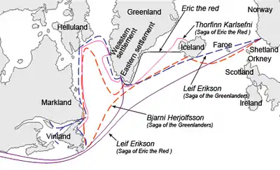 Скандинавські саги - це письмові версії давніх усних оповідей. Дві ісландські саги, які зазвичай називають Сагами про гренландців та Сагами про Еріка Рудого, описують досвід скандинавських гренландців, які виявили та намагалися заселити землю на захід від Гренландії, яку вони назвали Вінланд. Саги свідчать про те, що поселення Вінланд не вдалося через конфлікти в скандинавській громаді, а також між скандинавами та корінними жителями, яких вони зустрічали, яких вони називали скрелінґами . [24]
