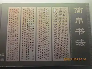- Не меншу цінність мають і скрипти та стилі начертання ієрогліфів. Знахідки підтверджують, що етап стандартизації шрифтів з метою економії часу і шовку на рукописи на момент їх закладення у поховання вже було завершено.