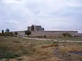 Стіна середньовічної міської цитаделі (реконструкція). На дальньому плані - ханака Ахмеда Ясаві.
