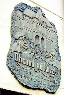 ![]() Пам'ятна дошка фільму, вмурована у стіну дому в Сабінові, що правив за магазин пані Лаутман | |