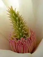 Зліва направо: Листя (Michelia alba). Квітка (Магнолія Ватсона). Внутрішня частина квітки (Магнолія гола). Зелений плід (Magnolia sprengeri). Зрілий плід та насіння (Magnolia cylindrica). | ||||||||||