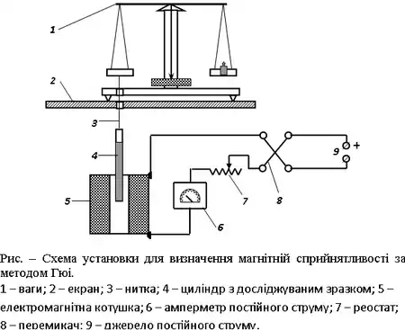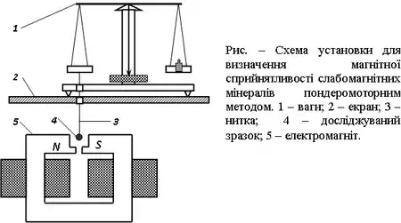 Для визначення магнітної сприйнятливості застосовують пондеромоторний метод Фарадея, метод Гюї, а також електромагнітний ізодинамічний сепаратор. Сепаратор складається із сильного магніту з довгими полюсами такої конфігурації, що забезпечує однорідність магнітного поля у зазорі, куди поміщений вібролоток із немагнітного матеріалу. Спочатку при вибраних куті нахилу лотка та струмі у обмотках електромагніту визначають постійну сепаратора С з використанням матеріалу. Якщо узяти речовину з відомою магнітною сприйнятливостю χ0 та при рівності гравітаційної і магнітної сил визначити кут нахилу лотка α в і величну струму у обмотках електромагніту І, то постійну сепаратора С можна розрахувати.