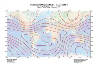 Інтенсивність магнітного поля Землі змінюється в межах від 23 мкТл в районі екватора до 61 мкТл в районі полюсів[1]. [уточнити]