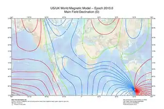 - Широтну. Кут в горизонтальній площині даної точки між географічним та магнітним меридіанами цієї самої точки називають магнітним схиленням (D). Якщо найближчий до полюса відрізок магнітного меридіана розташований на схід від географічного — схилення східне, або додатне; в іншому випадку воно західне, тобто від'ємне. Лінії на карті, що з'єднують точки з однаковими значеннями магнітного схилення називаються ізогонами[3].