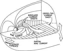 У багатьох магнітодинамічних системах електричний струм спресований у майже двовимірні стрічки, які мають назву площини струму (англ. current sheets). Вони ділять рідину на магнітні сектори, всередині яких струми відносно слабкі. Вважається, що площини струму у сонячній короні мають товщину лише кілька кілометрів, що тонко у порівнянні з магнітними секторами, які мають у товщину сотні та тисячі кілометрів. В магнітосфері Землі площини струму розділяють топологічно чіткі сектори, ізолюючи більшість іоносфери Землі від сонячного вітру.