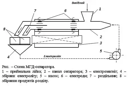 Схема МГД-сепаратора наведена на рисунку. Вихідний матеріал у сепаратор подається в приймальну лійку 1 каналу 2 МГД-сепаратора. Канал сепаратора повинен бути виготовлений з немагнітного і непровідного матеріалу, щоб не екранувати робочі поля. Канал розташовується в зазорі електромагніту 3. Електроліт зі збірника 4 насосом 5 подається в завантажувальну зону каналу. Електричний струм до електроліту підводиться через електроди 6, що установлені в каналі. Продукти збагачення в розвантажувальній зоні каналу діляться роздільником 7 і направляються в збірники 8.