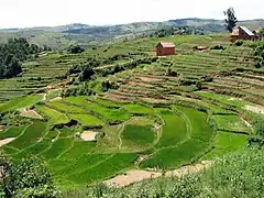Мадагаскар — гірська країна: понад половину острова займають гірські хребти, узгір'я і пасма високих горбів. Головний вододіл тягнеться з півночі на південь більш як на 800 км уздовж східного берега так, що між ним і океаном залишається порівняно вузька смуга низовини. На схід гори обриваються круто. На заході до них прилягають узгір'я, що величезними східцями знижуються в бік Мозамбікської протоки. Найвищі гори — Анкаратра і Царатанана — містяться всередині і на півночі острова. Це групи згаслих вулканів 2000—2500 м заввишки. Через усю східну частину острова з півночі на південь простяглося Центральне нагір'я (Високе плато) висотою 800—1500 м, у межах якого виділяють масиви: Царатанана — найвища точка Марумукутру (2876 м), Анкаратра — г. Цяфаявона (2644 м), Вухімехеті (1956 м).