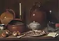 Карло Маджині .«Натюрморт з посудом, цибулею та листом»