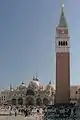 Дзвіниця на картині митця ще не має сучасного завершення-шатро. Від помилок у розрахунках під час будівництва дзвіниця впала. Її відновили на початку 20 століття. Цікаво, що бурхливу ініціативу з відновлення дзвіниці Сан Марко виявили туристи та багатії з інших держав, а не самі венеціанці. Вони створили особливий грошовий фонд і практично зобов'язали очільників міста відновити зруйновану споруду, один з неофіційних символів міста на Адріатиці.