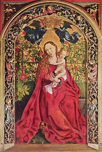 Німецький живописець і графік[4] Мартін Шонгаеур створив «Мадонну в альтанці з троянд» в 1473 році спеціально для церкви Святого Мартіна в місті Кольмаре на території Франції. На ній зображена Діва Марія, одягнена в червоне, разом з немовлям Христом, якого вона тримає на своїх руках. Вони знаходяться в альтанці, і їх оточують троянди. Ангели, одягнені в блакитне, тримають над головою Мадонни корону[2]. Її голова трохи нахилена в сторону[5]. У картини є золотистий фон[2]. Ймовірно, в творі присутні алюзії на біблійний «замкнений сад»[6]. Альтанка з троянд на картині Шонгаеура символізує рай[4].