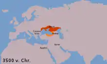 Початкове поширення Майкопської культури позначене жовтогарячим кольором