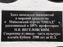 Майкопський курган, Ошад — пам'ятник епохи ранньої бронзи. Датується другою половиною 4-го тисячоліття до Р. Х. Курган також має давнє найменування — «Ошад», що походить з адизької легенди. Основне поховання є похованням знатної людини й двох, як вважається, жінок. Розташовувався на східній околиці міста Майкопа, на перехресті вулиць Курганної та Підгірної.