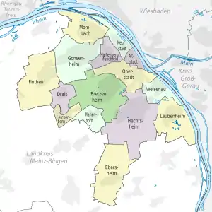 Майнц знаходиться на західному березі Рейну, на протилежному березі знаходиться місто Вісбаден. Історично ці міста були містами-суперниками: Майнц — консервативний католицький центр, а Вісбаден — демократичне місто-курорт, де переважають протестанти.