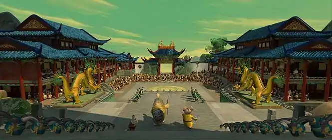 У дворі Нефритового Палацу. Шалена П'ятірка вишукується у колі у самому центрі, Майстер Уґвей готовий визначити того, хто стане Воїном Дракона. Починає витягувати палець, показуючи на Тигрицю, аж раптом над двором злітає купа феєрверків і з небес падає Панда прямо перед Тигрицею. Тигриця запитала, на кого він вказує. Майстер Уґвей відповів, що на Панду. Весь двір здивувався Панду віднесли до Священної Зали Воїнів.