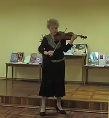 ![]() Валентина Макарова виступає в Сумській обласній науковій бібліотеці (2016) | |