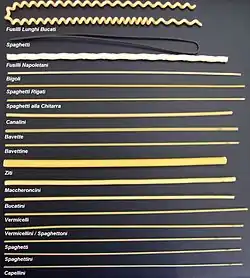 - Спагеті (італ. Spaghetti; від італ. spaghe — рядок) — довгі, округлі і досить тонкі (1,8 мм — 2,0 мм). Спочатку їх довжина становила 50 см. Зараз для зручності її скоротили до приблизно 25 см, але можна знайти і довгі спагеті (Виробники зазвичай поміщають їх в розділ «Спецформат»).