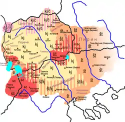 - На місці ѣ доволі послідовно вживається е. Порівняйте укр. дідо = мак. дедо = болг. дядо, укр. хліб = мак. леб = болг. хляб.