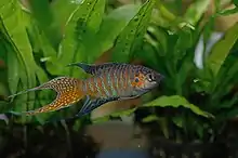 Самці помітно більші за самок, мають яскравіше забарвлення, плавці у них більші й мають довші «нитки». Забарвлення самок жовтувато-коричневе з мало помітними поперечними смугами.