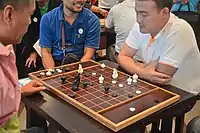 - Кінь (тай. ม้า ма, кінь) рухається як і кінь у шахах. Проте через відсутність поділу дошки на темні і світлі клітинки гравцям візуально не так легко визначити куди ходить кінь.