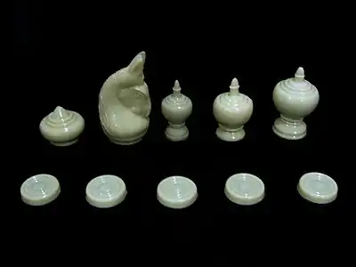 - Традиційно фігури пішаків робили з мушель каурі, які раніше використовували як гроші. Мушлі природно мають темне і світле забарвлення. При заміні пішака мушлю перевертали отвором догори[2].
