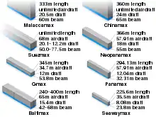 - Розміри вантажних суден: Handymax, Panamax, Suezmax, Capesize