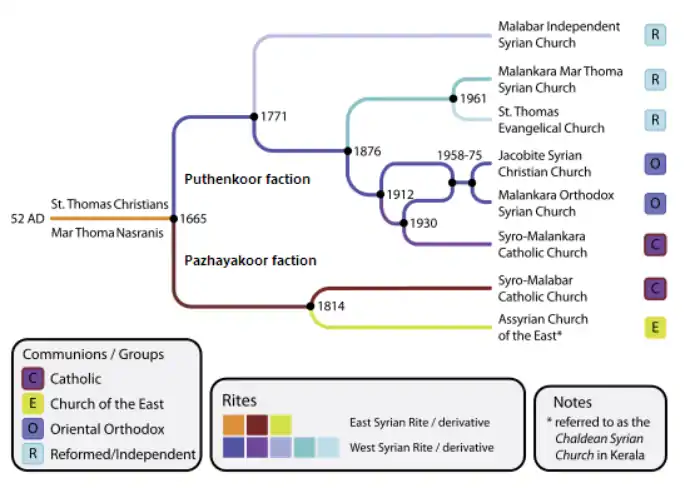 Як повідомляється, християни Святого Томи з узбережжя Малабара спілкувались із Східною Церквою з 496 по 1599 рік.[14] Вони отримали канцелярську підтримку від перських єпископів, які подорожували до Керали на торгових кораблях по пряному шляху. Протягом 16 століття зусилля португальського Падродео довести християн Святого Томи до католицизму латинського обряду призвели до першого з кількох розладів у громаді та створення фракцій Сиро-Малабарської та Маланкарської церков. Християни Святого Томи в даний час поділяються на кілька груп.