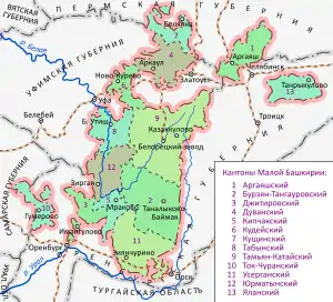 У грудні 1917 року III Всебашкирський установчий курултай ухвалив положення «Про автономне управління Башкурдистану», згідно з яким автономія складалася з дев'яти кантонів: Барин-Табинського, Бурзян-Тангауровського, Джитировського, Ічкин-Катайського, Кипчацького, Куваканського, Там'янського, Ток-Чуранського та Усерганського кантонів.[6][7]