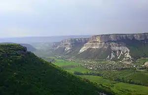 ![]() Вид на Мале Садове з лівого берегу Бельбекського каньйону | |