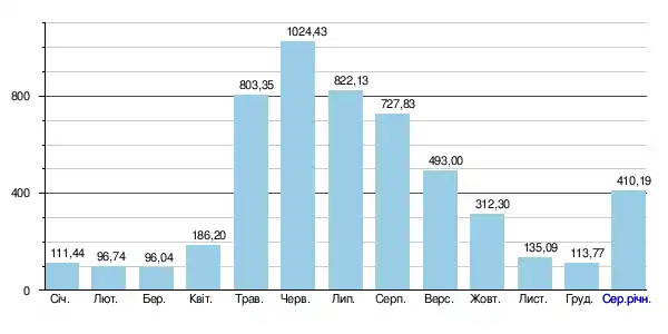 За період спостереження, абсолютний мінімальний місячний стік (абсолютний мінімум) становив 76,3 м³/с (у межень березня 1979 року), абсолютний максимальний місячний стік (абсолютний максимум) становив 1680 м³/с (у червні 1977 року)[5].