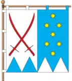 Квадратне полотнище розділене вертикально на дві рівновеликі смуги, древкову білу і вільну синю. На древковій частині дві червоні козацькі шаблі в косий хрест, на вільній — сім жовтих восьмипроменевих зірок, одна, дві, одна, дві і одна. Знизу на древковій частині виходить два синіх, на вільній — два білих трикутники на 1/4 висоти прапора[8].