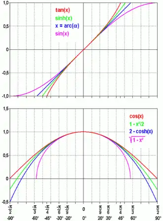 Розширенням Маклорена (розкладання в ряд Тейлора при наближенні до 0) відповідної тригонометричної функції є [1]