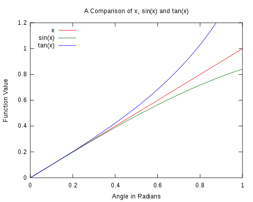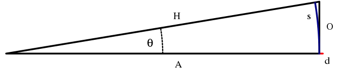 Протилежна вертикальна сторона, O, приблизно дорівнює довжині синьої дуги, s. Узагальнюючи факти з геометрії, s = A*θ, із тригонометрії, sin θ = O/H і tan θ = O/A, а із зображення беремо що, і , що приводить до: