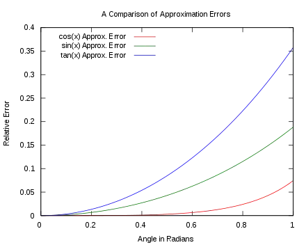 Малюнок 3 показує похибку апроксимації малих кутів. Кути, при яких відносна похибка перевищує 1% є наступними: