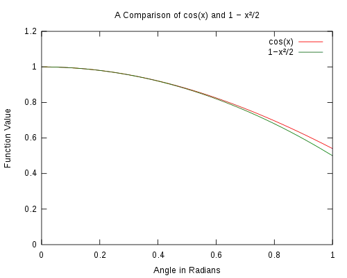 Графік 2. Порівняння функції cos(θ) з 1 - θ2/2. Видно, що при зменшенні значення кута до 0 наближення стає кращим.