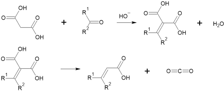 Основи приєднуються до цієї кислоти, стаючи донорами електронної пари для протона. Такі солі (якщо там трианіон) можуть приєднувати альдегіди та кетони.Продукти цієї реакції під дією кислот утворюють ненасичені двоосновні карбонові кислоти, які при нагріванні декарбоксилюються, утворюючи одноосновні ненасичені карбонові кислоти:[2][6]
