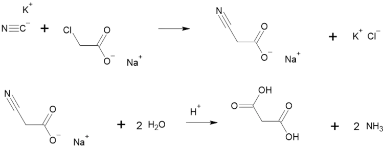 Основним способом одержання малонової кислоти є реакція ціаніду калію з хлорацетатом натрію. При кислотному гідролізі отриманого нітрилацетату натрію утворюється малонова кислота[2]: