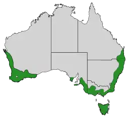 Ендемік Австралії. Поширений в узбережній зоні на південному заході та південному сході материка та в Тасманії. Мешкає у лісових та чагарникових районах.