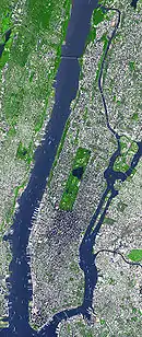 Острів Мангеттен розташований поблизу впадання річки Гудзон, що омиває його з заходу, у бухту Аппер-Нью-Йорк-Бей. Від материка, на якій розташований район Бронкс, на північному сході Мангеттен відділений річкою Гарлем, від острова Лонг-Айленд на сході та південному сході — протокою Іст-Ривер.